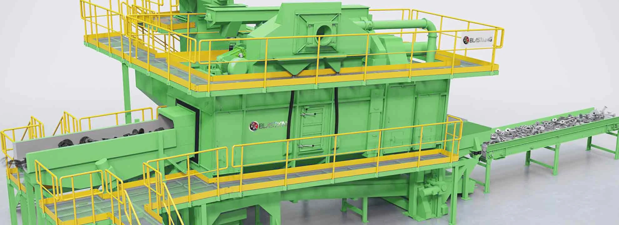Bogie Work Car Blast Machines are ideal for the economic sand removal and cleaning of large and heavy castings, such as castings for wind turbines. The use of the transport bogie with rotary table allows castings to be loaded and unloaded outside of the blast chamber by crane, and moved safely into and out of the machine.