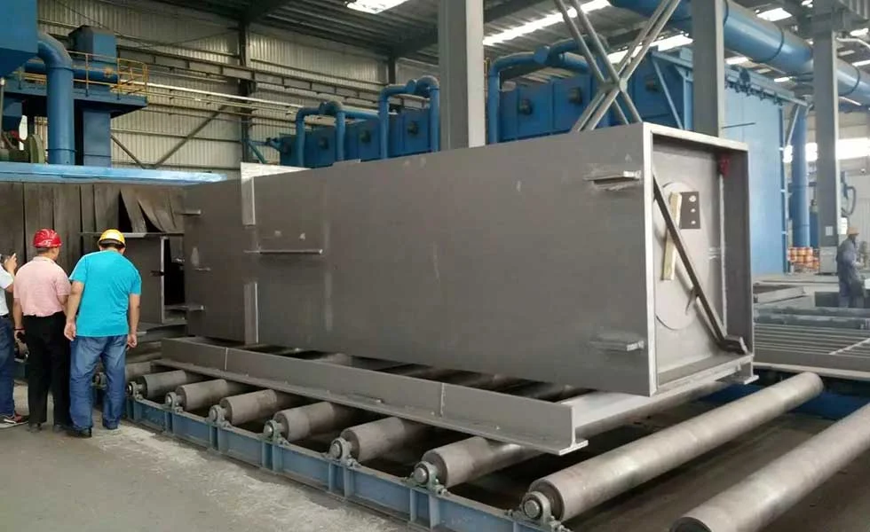 For most of the big parts whose length/height exceeds 6 meters, our know-how experienced engineer team recommends using the horizontal conveyor system to solve the blast processing handling problems, like roller conveyor shot blasting machine and tunnel type shot blasting machine. Sometimes the end-user has space restriction problems, so they have to take the vertical type shot blasting machine into consideration which will greatly solve their space limitation problems.